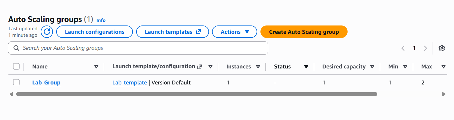 EC2 Auto Scaling This is a simple lab where a launch template is created in order to be used with an Auto Scaling Group. Screenshots: