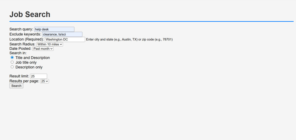 This project is a job search application that searches public job boards for results. In addition to searching for specified keywords, the user can also filter search results by excluding results with certain keywords.