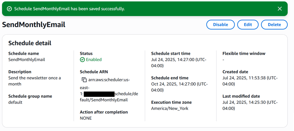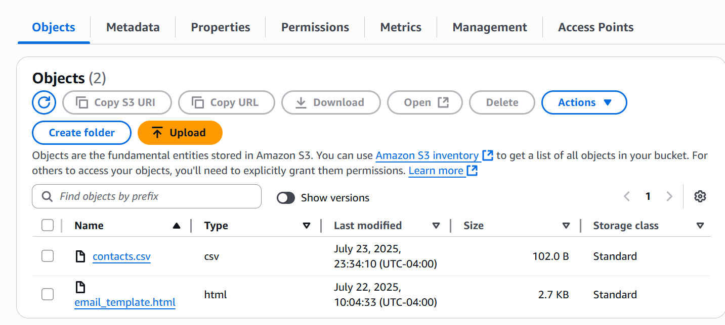 - S3 was used to store the csv file that contains the contact list and the HTML template used for formatting the newsletter content
